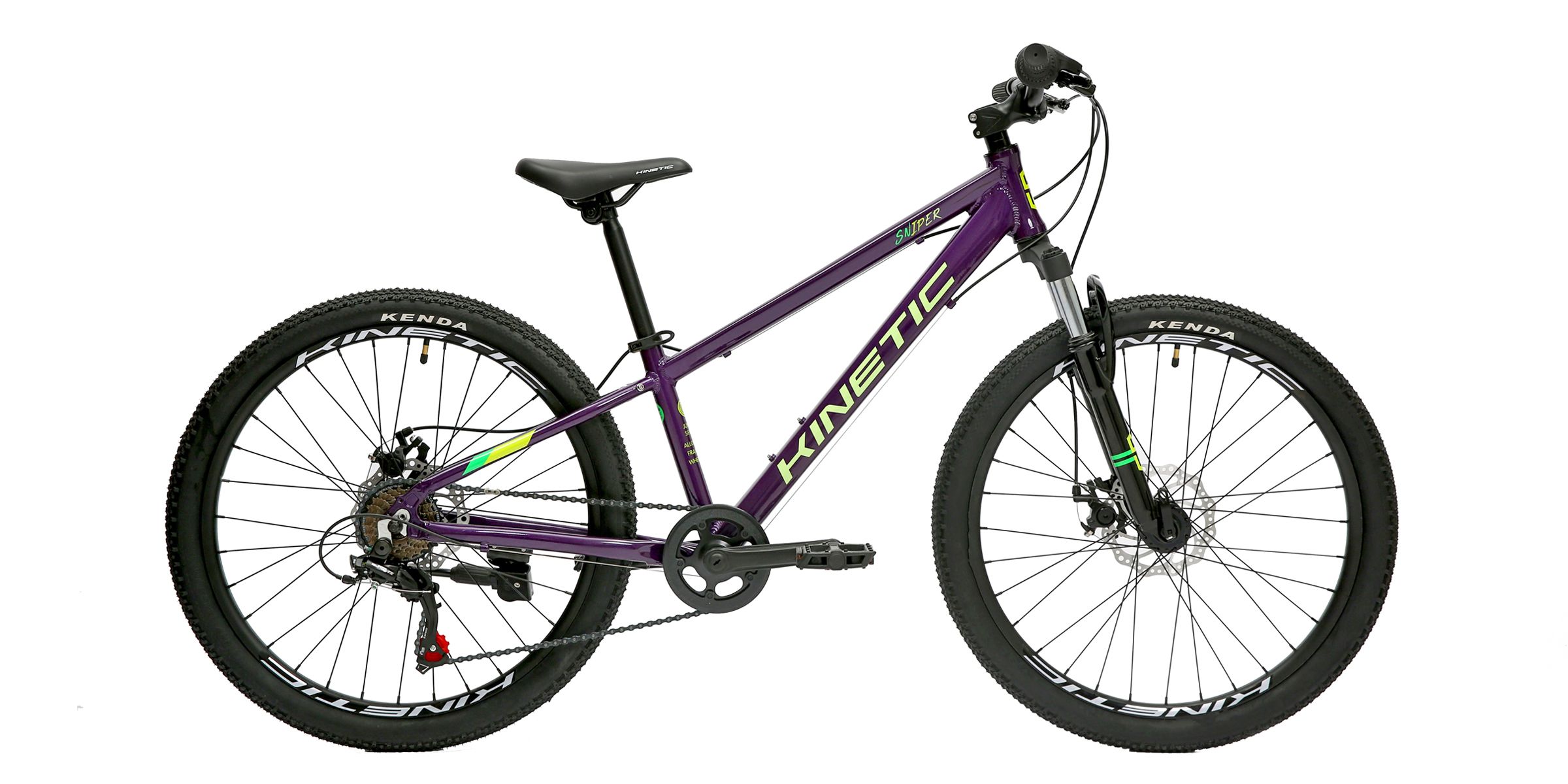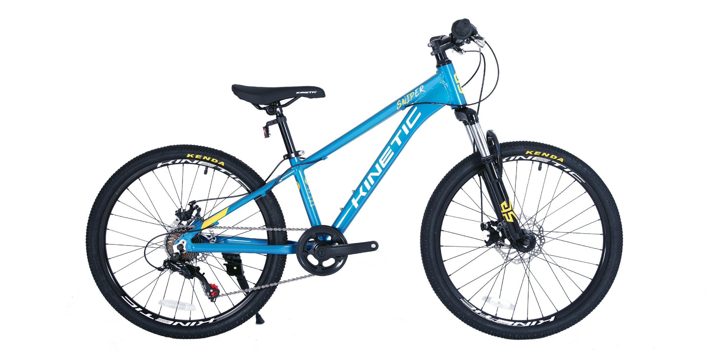 При розробці Kinetic Sniper ми орієнтувалися на наші гірські велосипеди для дорослих - в результаті вийшов справжній позашляховий велосипед невеликих розмірів, який ідеально підходить для молодих гірських байкерів. Доказом цього є легка алюмінієва рама, амортизаційна вилка і дискові гальма. Крім того, ланцюг надійно ховається під захисним кожухом, а покришки Kenda так само оптимально тримають дорогу, як і покришки на маминому або татовому велосипеді. Коли справа доходить до керованості, задоволення від водіння поєднується з безпекою.